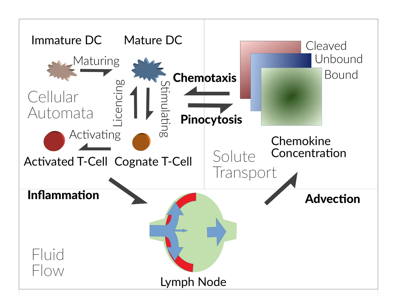 The lymphatic system has multiple functions; it is a drainage system that allows maintenance of fluid balance throughout the body, a crucial component of the immune system, and a provides a major route for cancer cell metastasis. [1]. Lymph nodes are stationed along the lymphatic network, sample the draining lymph and allow initiation of the adaptive immune response if antigen is detected. By using computer models we can see beyond experiments and understand the complex interactions between our cells, tissues and fluids. By creating and refining a set of rules for how T-cells and dendritic cells behave we can create simulations of hundreds of thousands of cells called cellular automata. This allows us to explore how the immune cells interact with each other to protect us from infection [1].