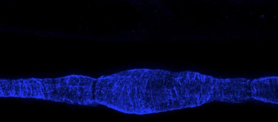 Lymphatic muscle cells in the wall of a rat mesenteric lymphatic vessel. The bulge at the centre of the image indicates the location of a lymphatic valve. From Zawieja et al., Am J Physiol Heart Circ Physiol 302:H643-H653, 2012.